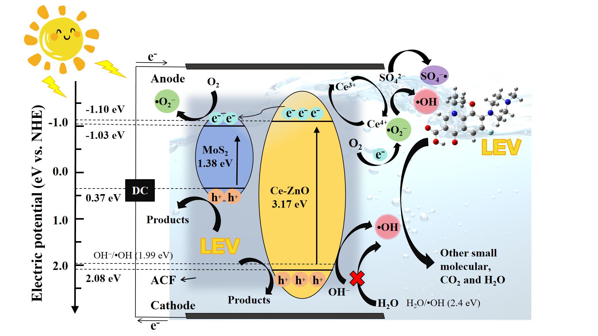 图1. Ce-ZnO/MoS2/ACF光电协同降解左氧氟沙星的机制